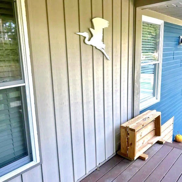 This large outdoor great blue heron bird taking flight is the perfect exterior wall art sign for your coastal home, beach house, or river home's exterior decor. Whether for your own personal home, or for a vacation rental property, our outdoor wall art signs will help your property to stand out with tropical curb appeal.