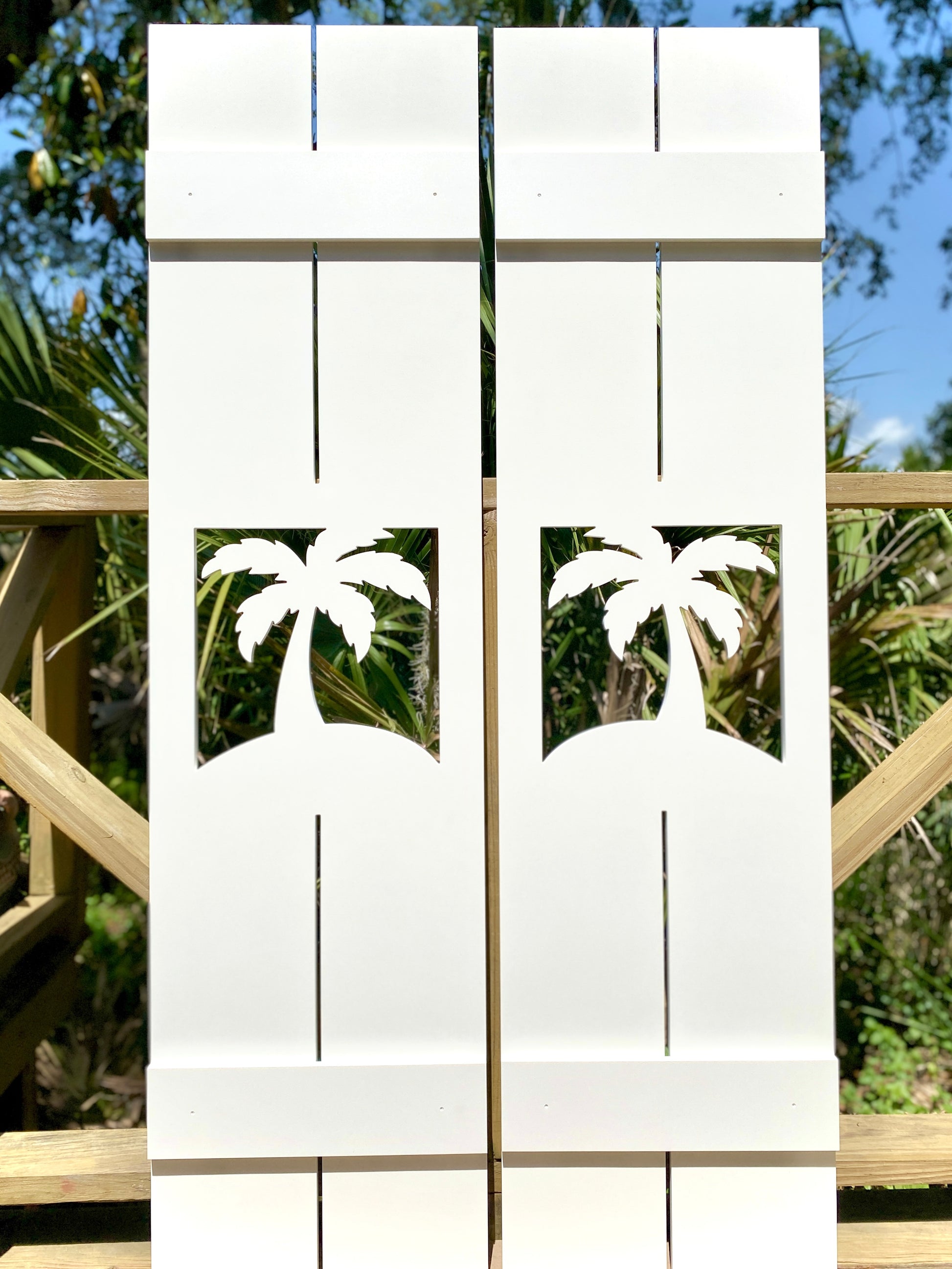 Bring tropical charm to your home with our custom weatherproof palm tree window shutters. Perfect for beach houses and coastal homes, built to last in any seaside climate. These board-and-batten style shutters instantly elevate curb appeal and add a unique coastal aesthetic to your exterior décor. Crafted from premium all-weather PVC board, our outdoor decorative shutters are built to withstand sun, salt air, and harsh climates—lasting for years even on direct oceanfront homes. Each shutter is custom made to your exact specifications, ensuring a perfect fit that enhances your windows and transforms your home’s exterior from plain to coastal chic.